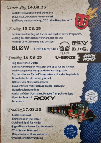 Als Vereinsvorstand und Anwohner von Remptendorf ist es mir eine Freude Euch mitteilen zudürfen, dass wir einen Platz auf der diesjährigen 700 Jahrfeier bekommen werden, um interessierten Besuchern unser schönes Hobby näher zubringen. Geplant sind Flugvorführungen von Flugzeugen und Hubschraubern. Für die kleinen Besucher möchten wir einen Fahrparcour aufbauen, wo sie mit Autos und LKW ihre Geschicklichkeit testen können.
